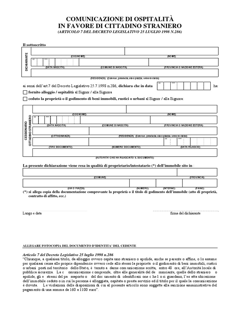 stranieiditalia.com › dichiarazione-di-ospitalitaDichiarazione di ospitalità modulo 2022 pdf (per stranieri ... Jun 06, 2022 · Dichiarazione di ospitalità modulo 2022 pdf. Potete scaricare il modulo dichiarazione di ospitalità Clicka qui. Come si compila la dichiarazione di ospitalità 2022. Questo video spiega cosa è e come si compila la dichiarazione di ospitalità 2022, prevista dall’art.7 D.lgs.286/1998 e spesso chiesta dalla Questura. questure.poliziadistato.it › it › TrevisoUFFICIO IMMIGRAZIONE - Polizia di Stato Oct 09, 2022 · Dichiarazione di ospitalità (presentata entro 48 ore da chi offre ospitalità ai cittadini stranieri profughi dall'Ucraina, anche se parenti o affini, ovvero cede allo stesso la proprietà o il godimento di beni immobili, mediante comunicazione scritta all'autorità locale di Pubblica Sicurezza - Questura di Treviso o al Commissariato di ...